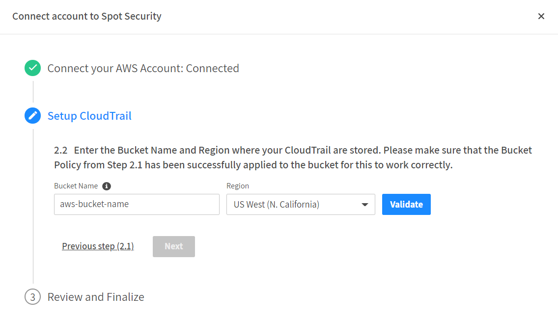 1. Enter the CloudTrail’s Bucket Name and Region, and click Validate.